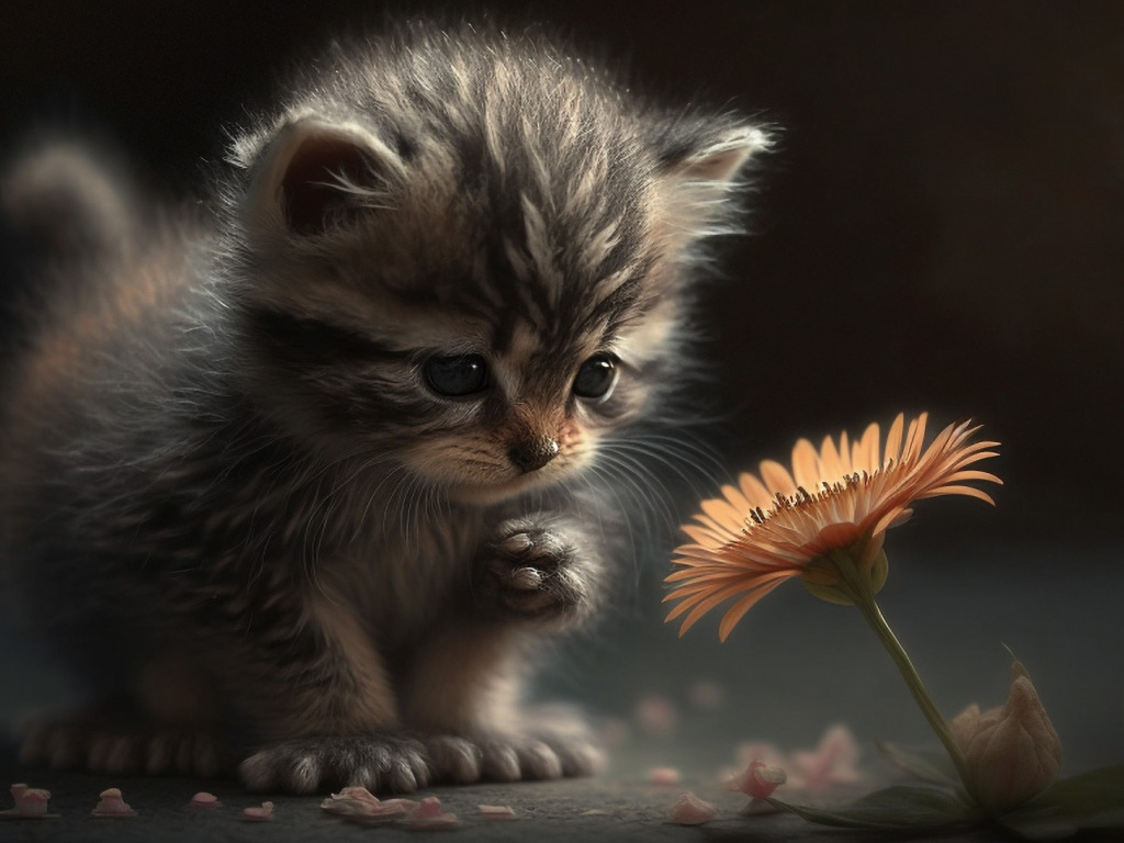 cat, light, flowers, pose, the dark background, grey, graphics, legs