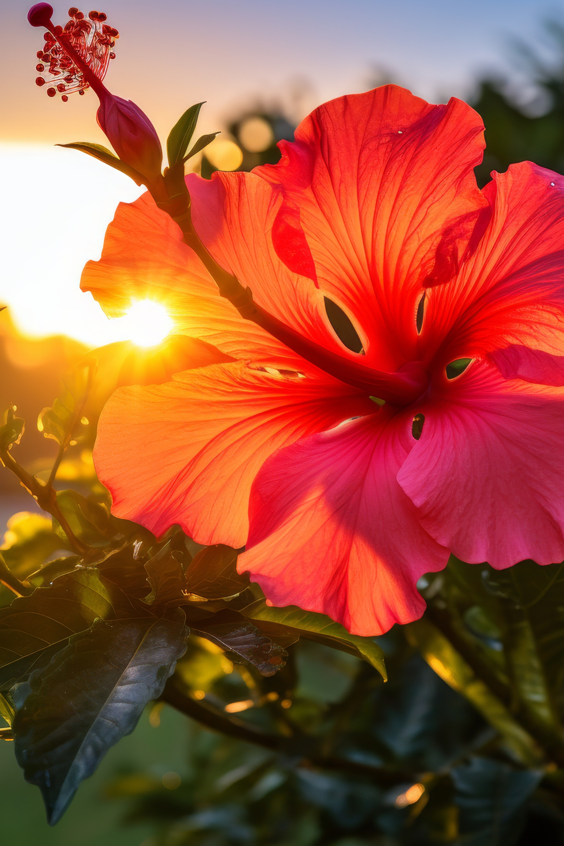 leaves, the sun, macro, rays, light, sunset, flowers, red