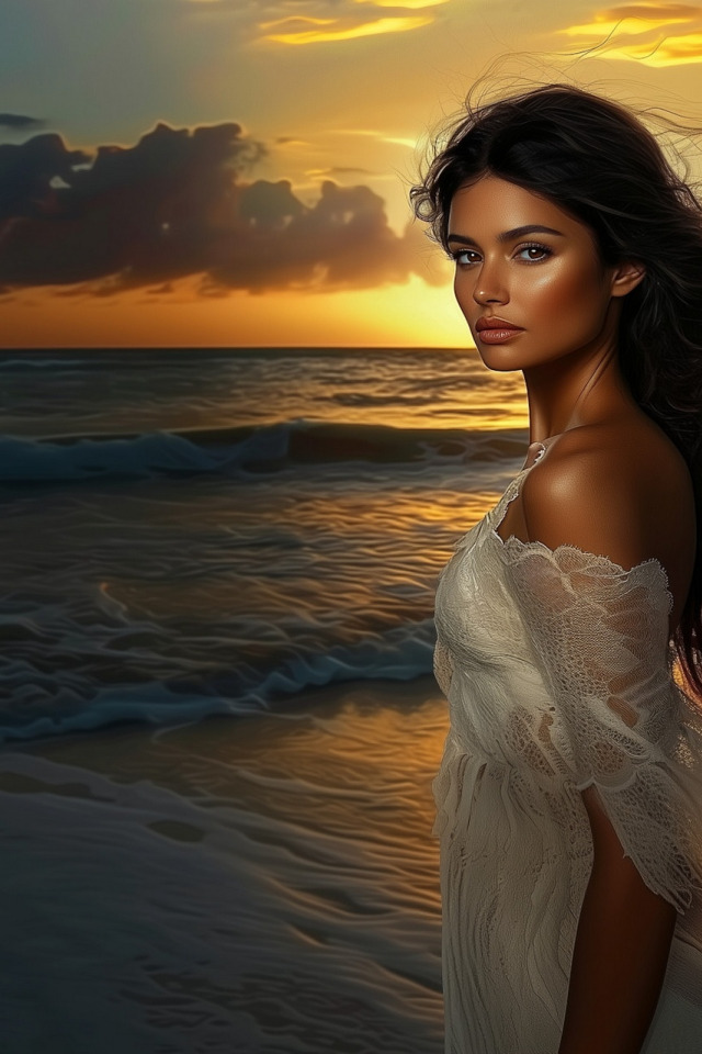 Back to Wallpaper sea, beach, look, girl, clouds, light, sunset, pose