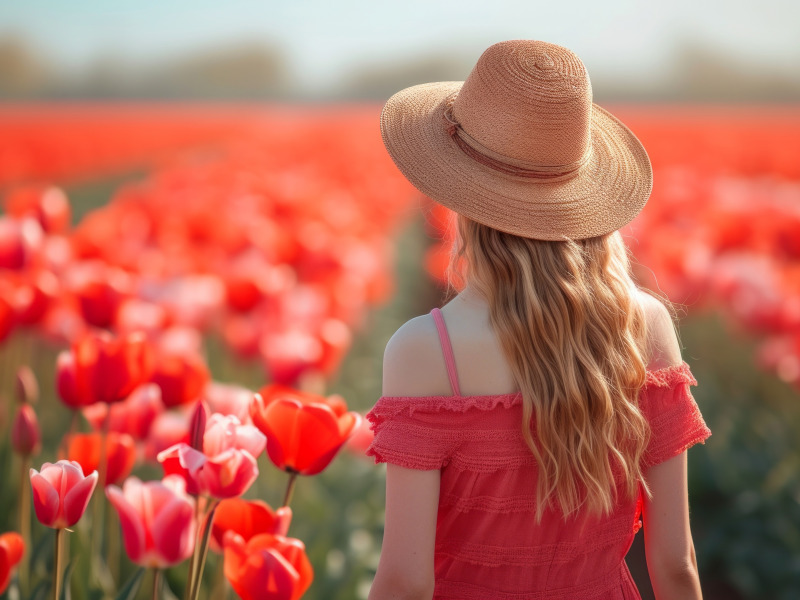 Back to Wallpaper field, girl, light, flowers, red, back, spring, hat