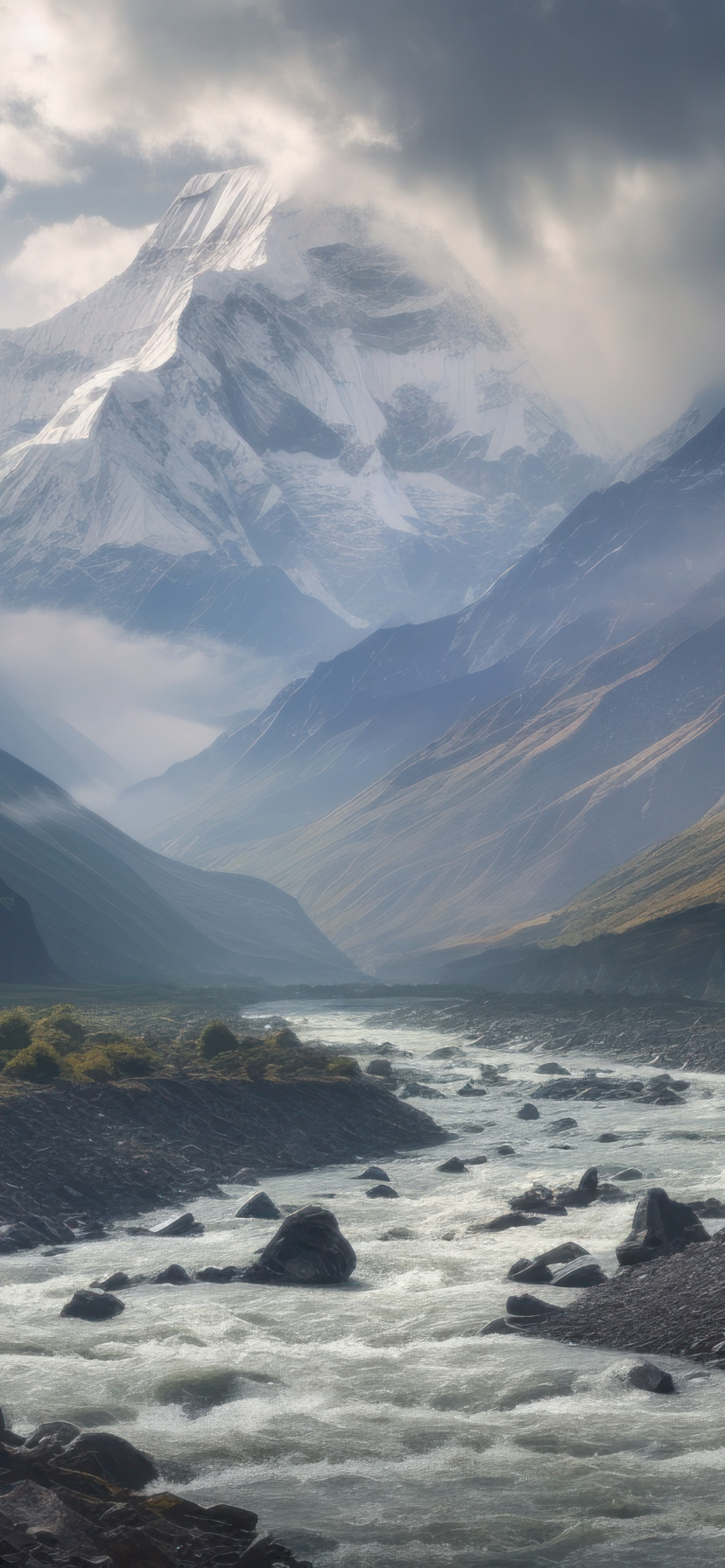 Back to Wallpaper clouds, snow, landscape, mountains, nature, fog, river, stones