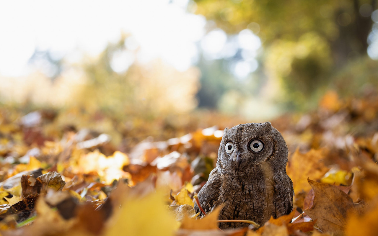 Back to Wallpaper autumn, look, owl, bird, foliage, bokeh, autumn leaves, owl