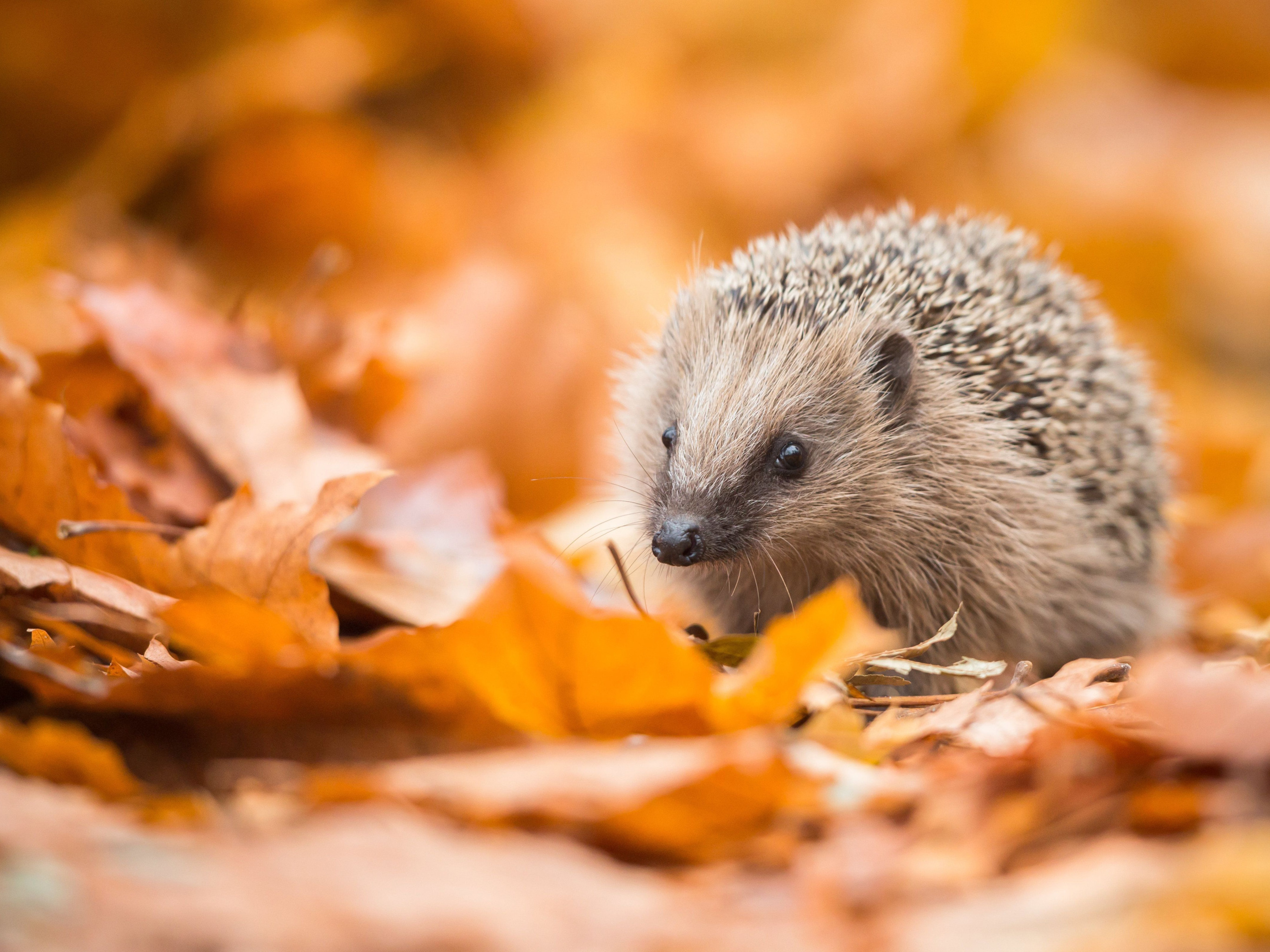 Back to Wallpaper autumn, look, foliage, muzzle, hedgehog, bokeh, autumn leaves, hedgehog