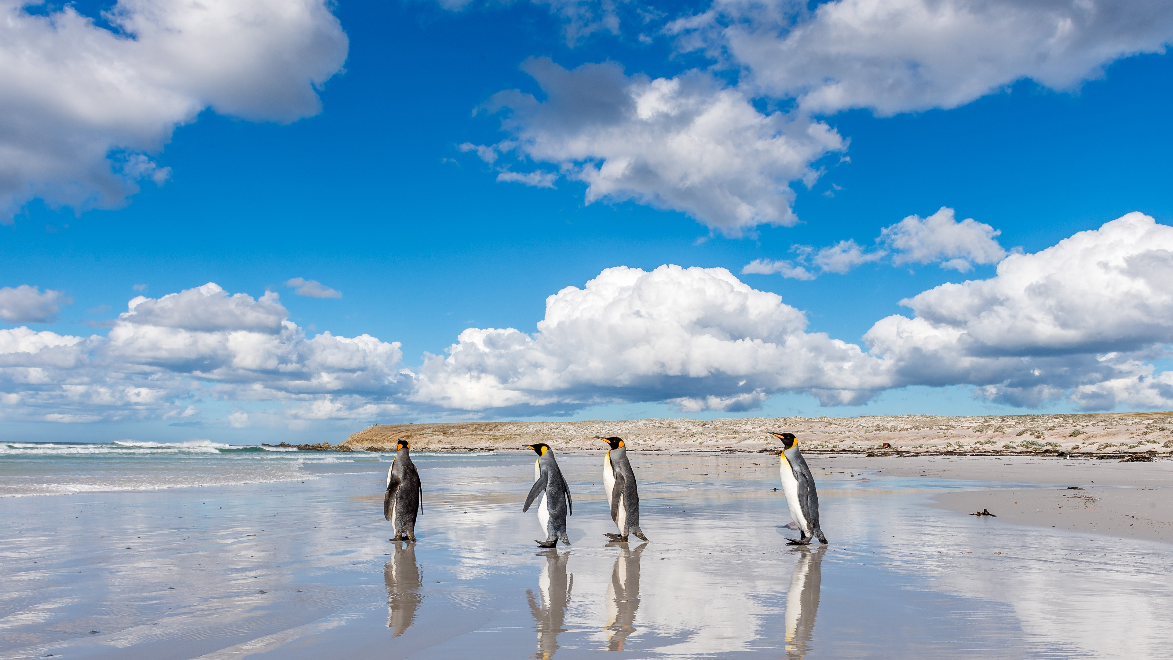 Back to Wallpaper sea, beach, clouds, blue, background, shore, penguins, walk