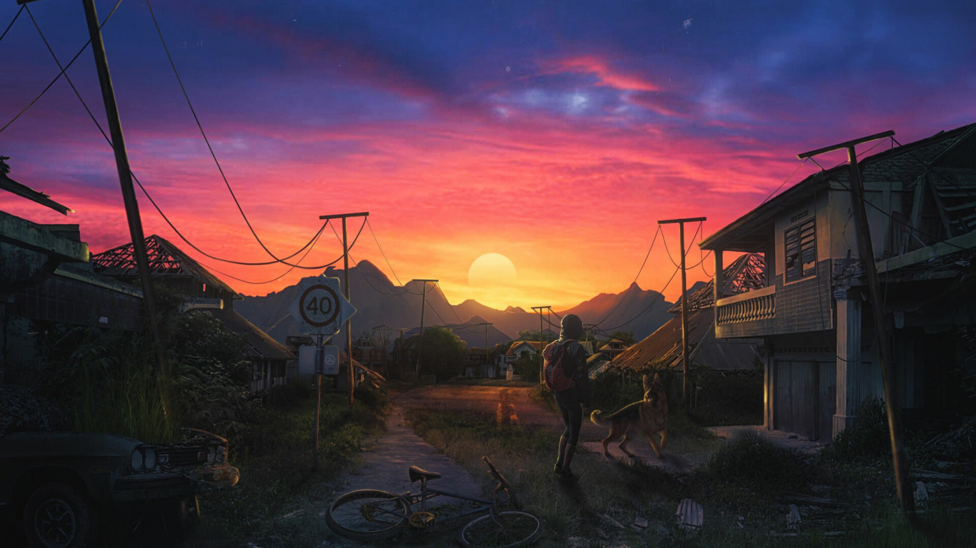 the sun, sunset, mountains, fiction, dawn, Apocalypse, people, home