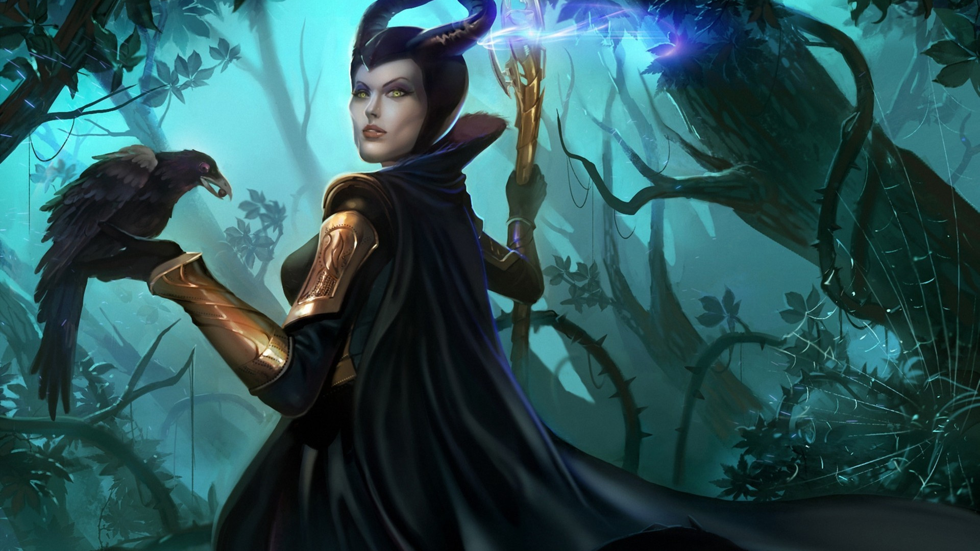Back to Wallpaper forest, girl, web, art, staff, Raven, Marvel, Loki