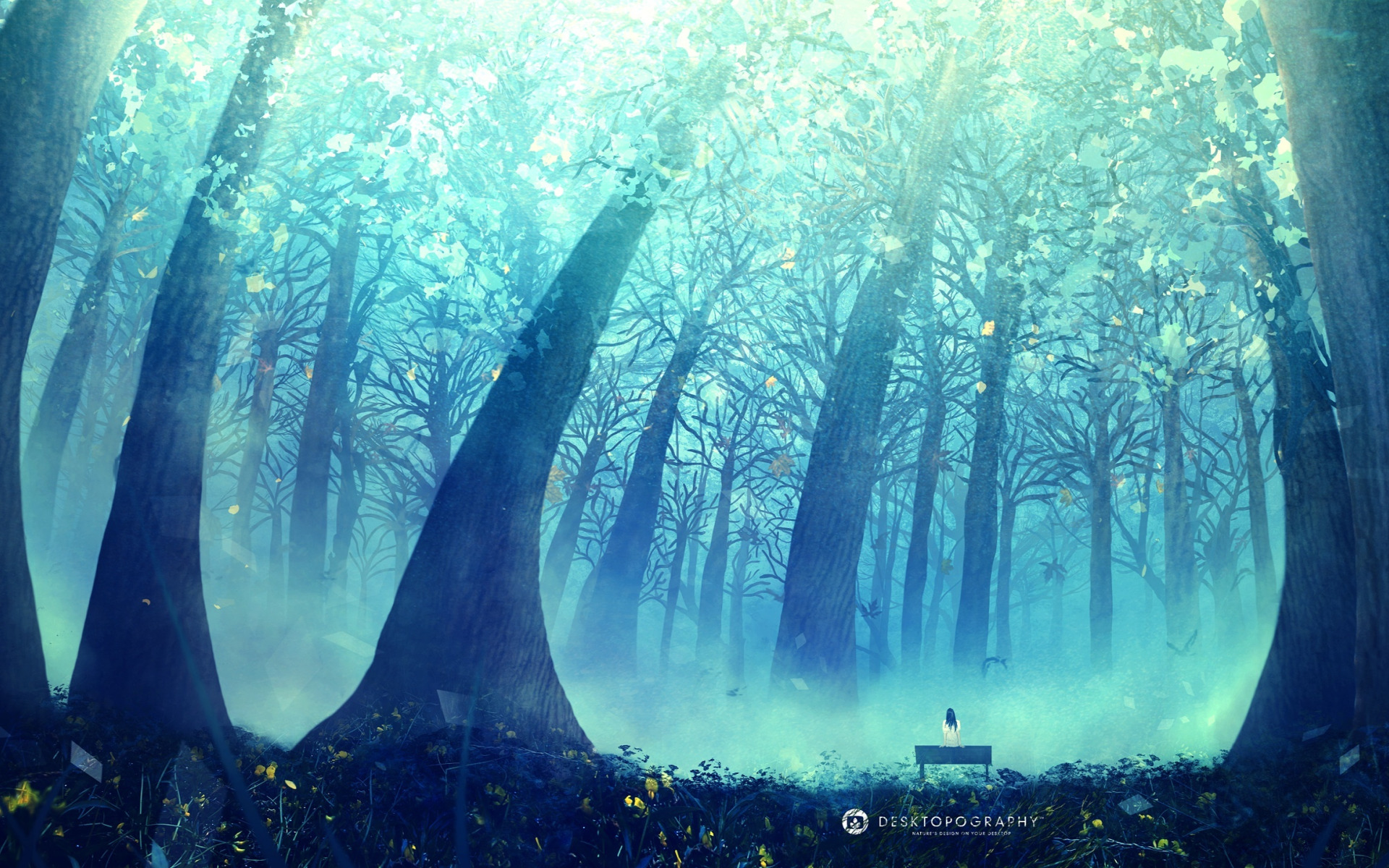 light, trees, bench, glow, girl, desktopography