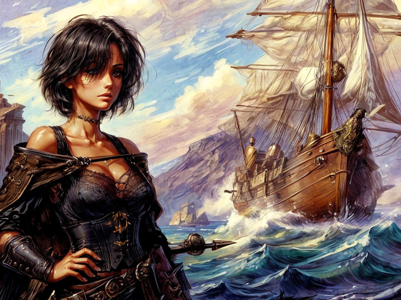 sea, girl, the city, stones, rocks, ship, sailboat, outfit