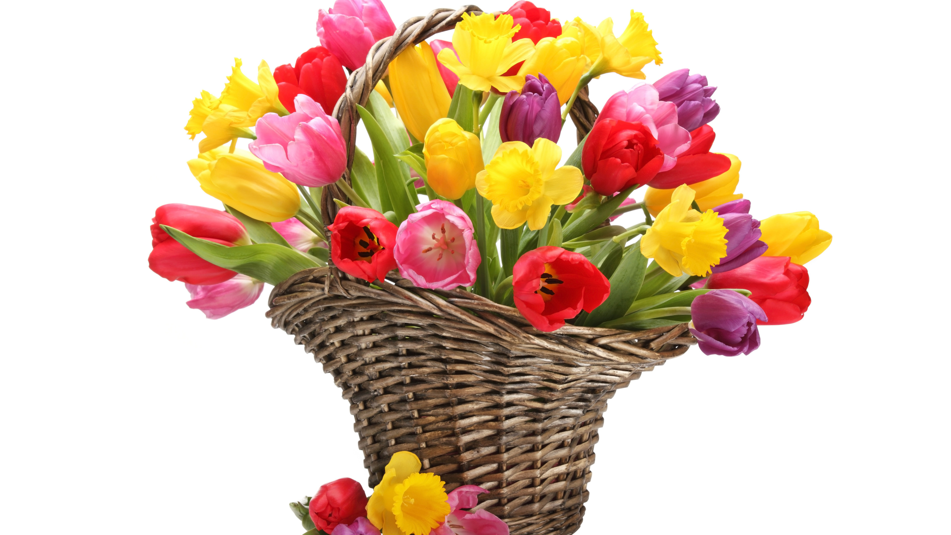 Back to Wallpaper flowers, yellow, red, basket, bouquet, tulips, daffodils