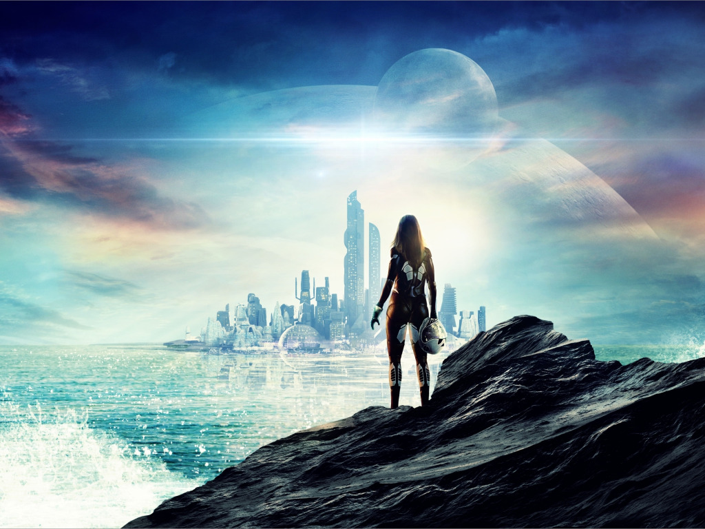 sea, the sky, girl, clouds, squirt, city, the city, future