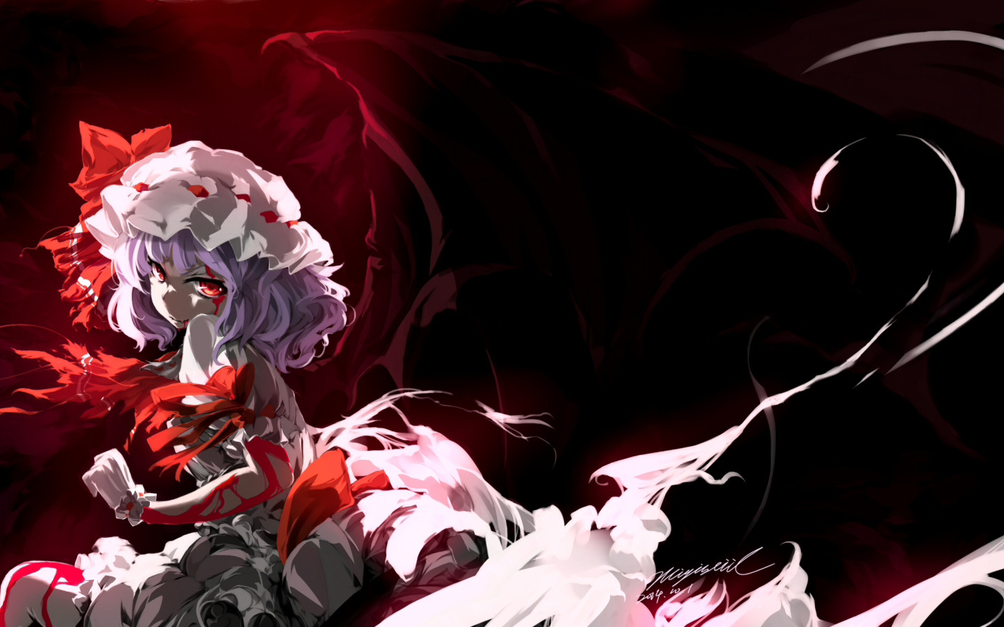 Back to Wallpaper darkness, blood, red eyes, art, vampire, black wings, Touhou Project, Remilia Scarlet