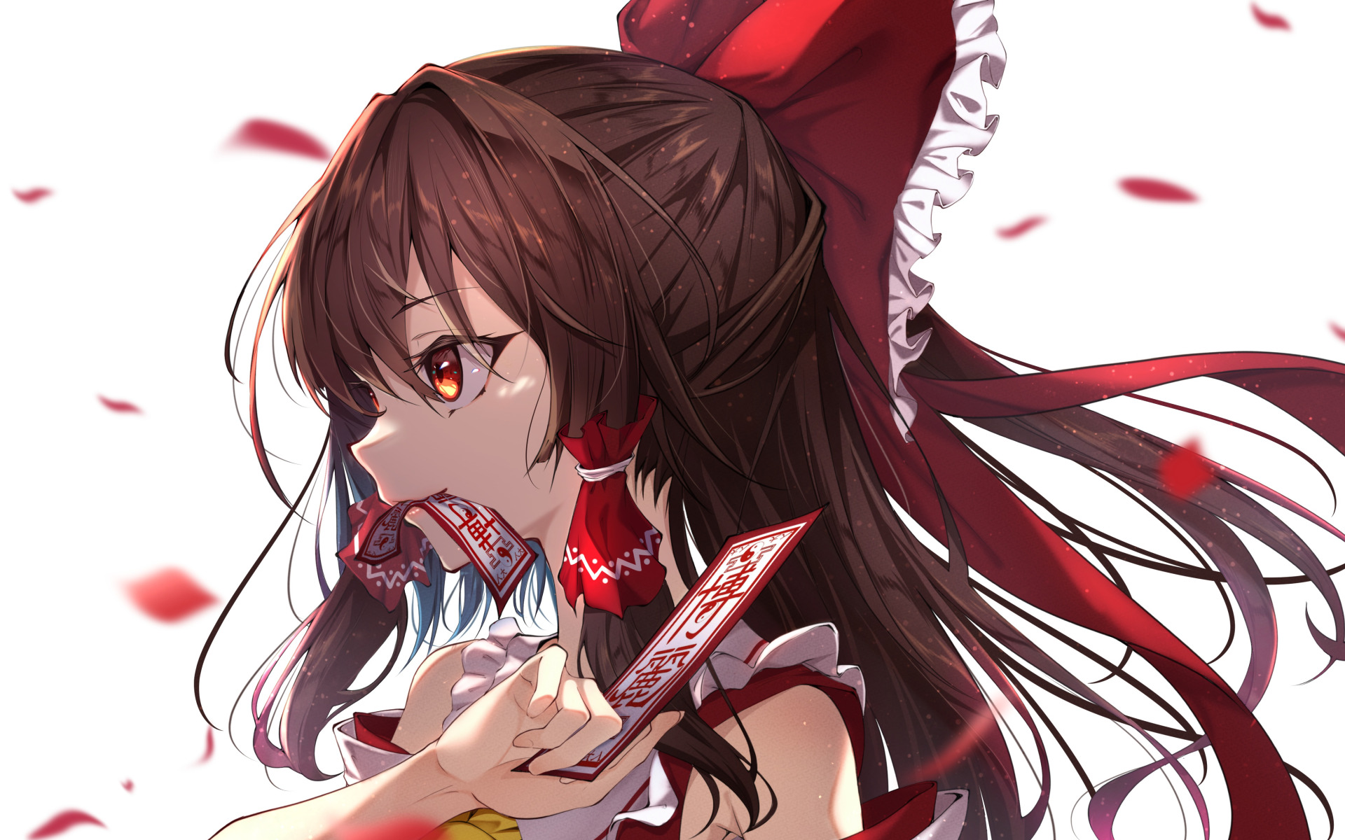 Back to Wallpaper girl, petals, Touhou Project, Reimu Hakurei, ofuda