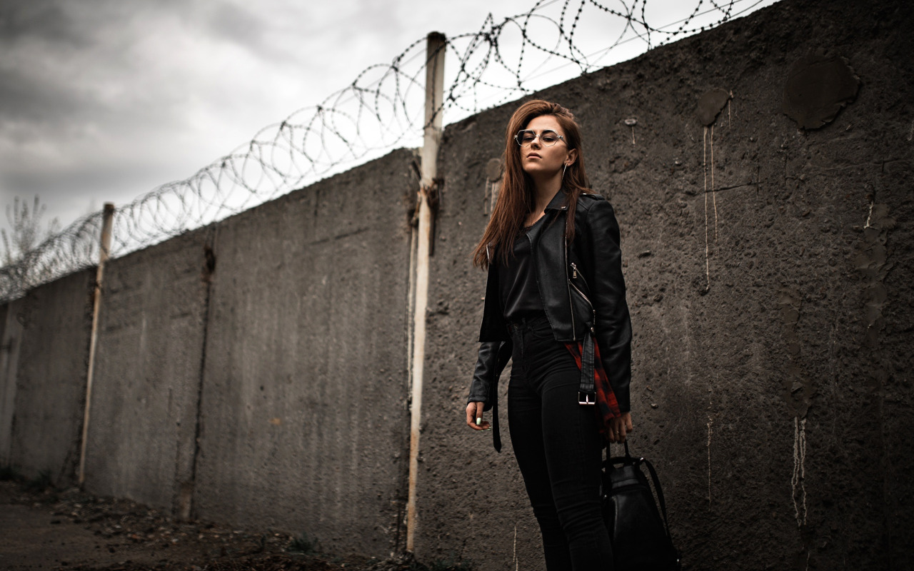 Back to Wallpaper look, wall, model, the fence, jeans, makeup, glasses, jacket