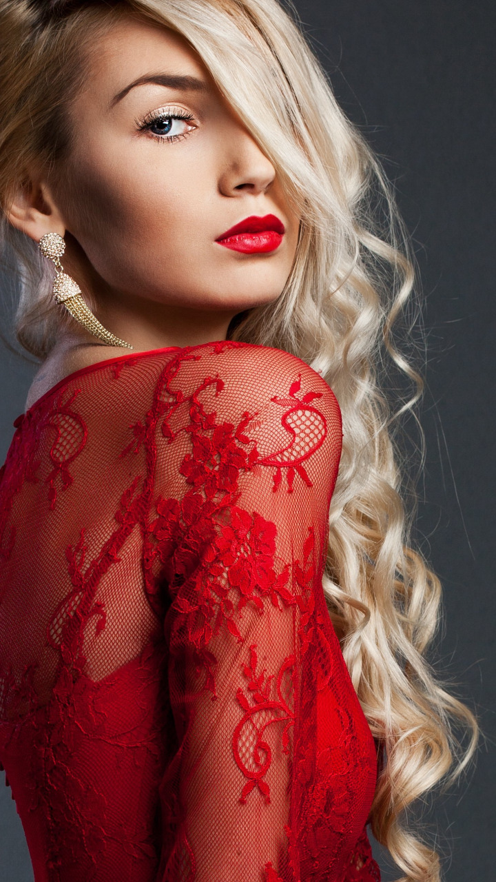 Back to Wallpaper look, girl, model, hair, makeup, lips, red dress, curls