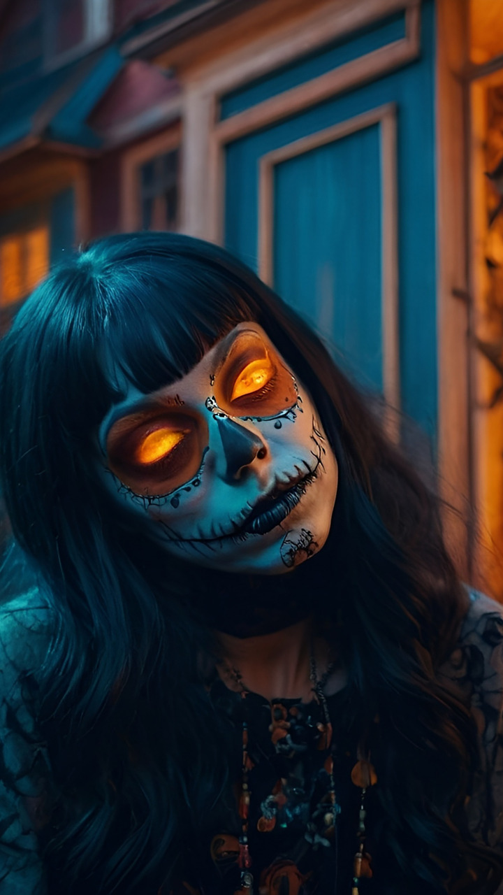Back to Wallpaper autumn, girl, night, lights, pose, skull, home, brunette