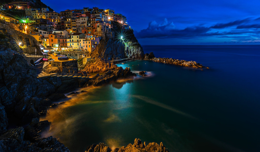 Back to Wallpaper road, sea, clouds, night, the city, stones, rocks, Italy
