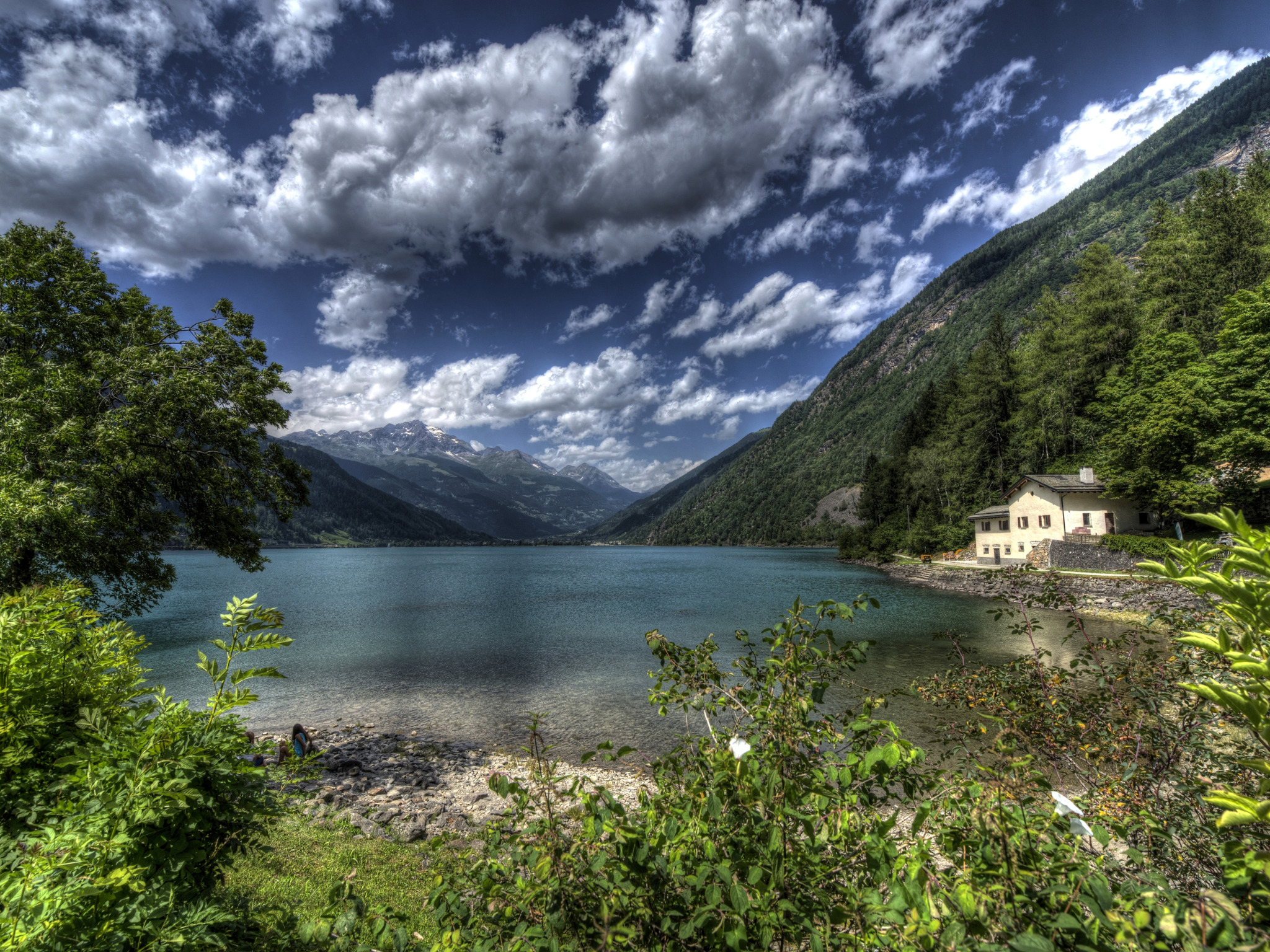 Back to Wallpaper clouds, trees, mountains, lake, stones, shore, HDR, home