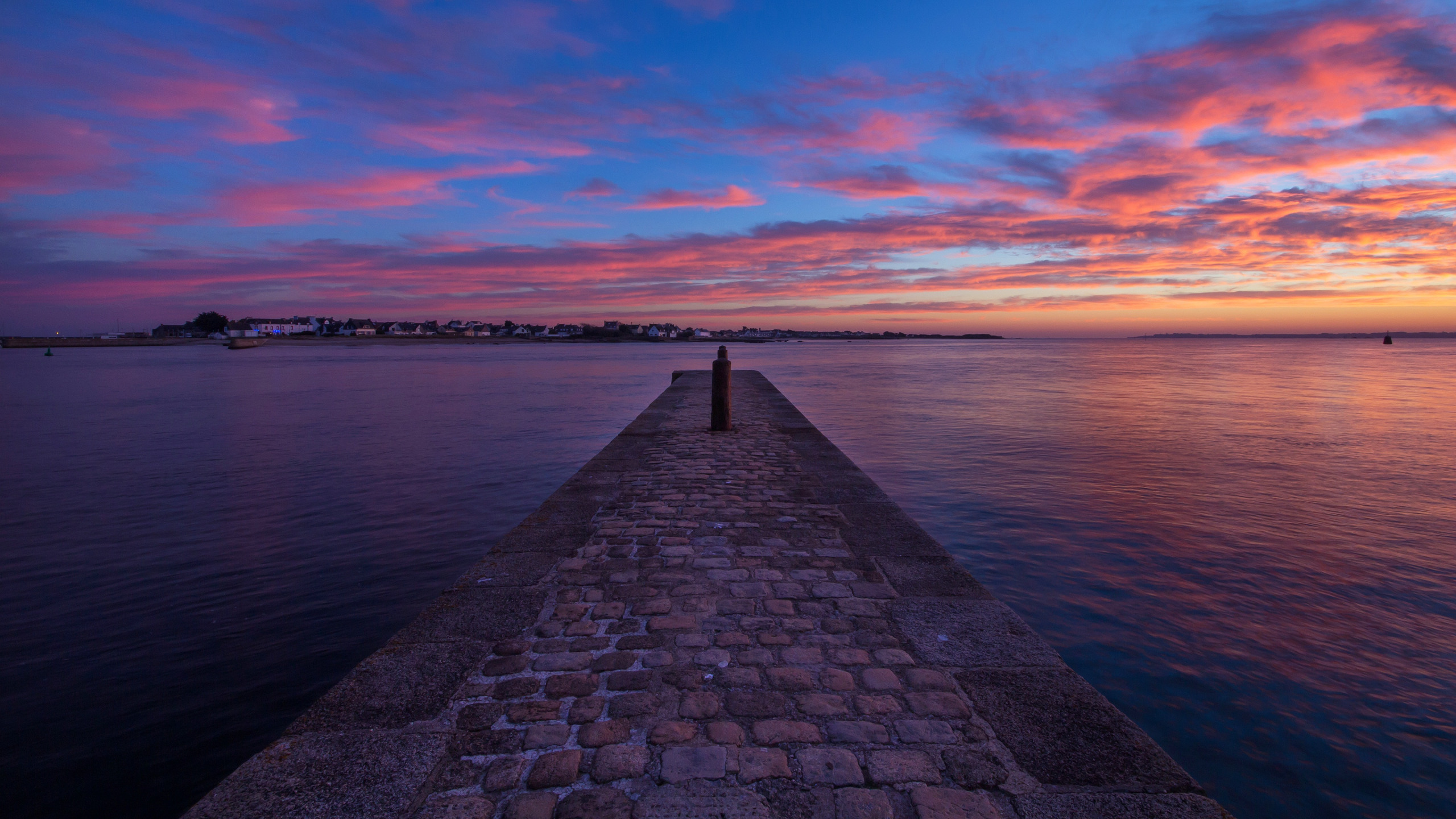 Back to Wallpaper sea, clouds, sunset, blue, shore, posts, tile, dal