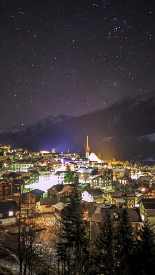 winter, the sky, stars, snow, mountains, night, the city, lights
