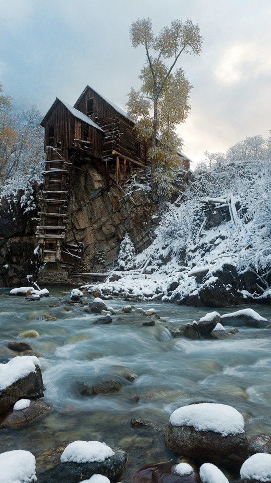 Back to Wallpaper snow, river, mill, Crystal Mill