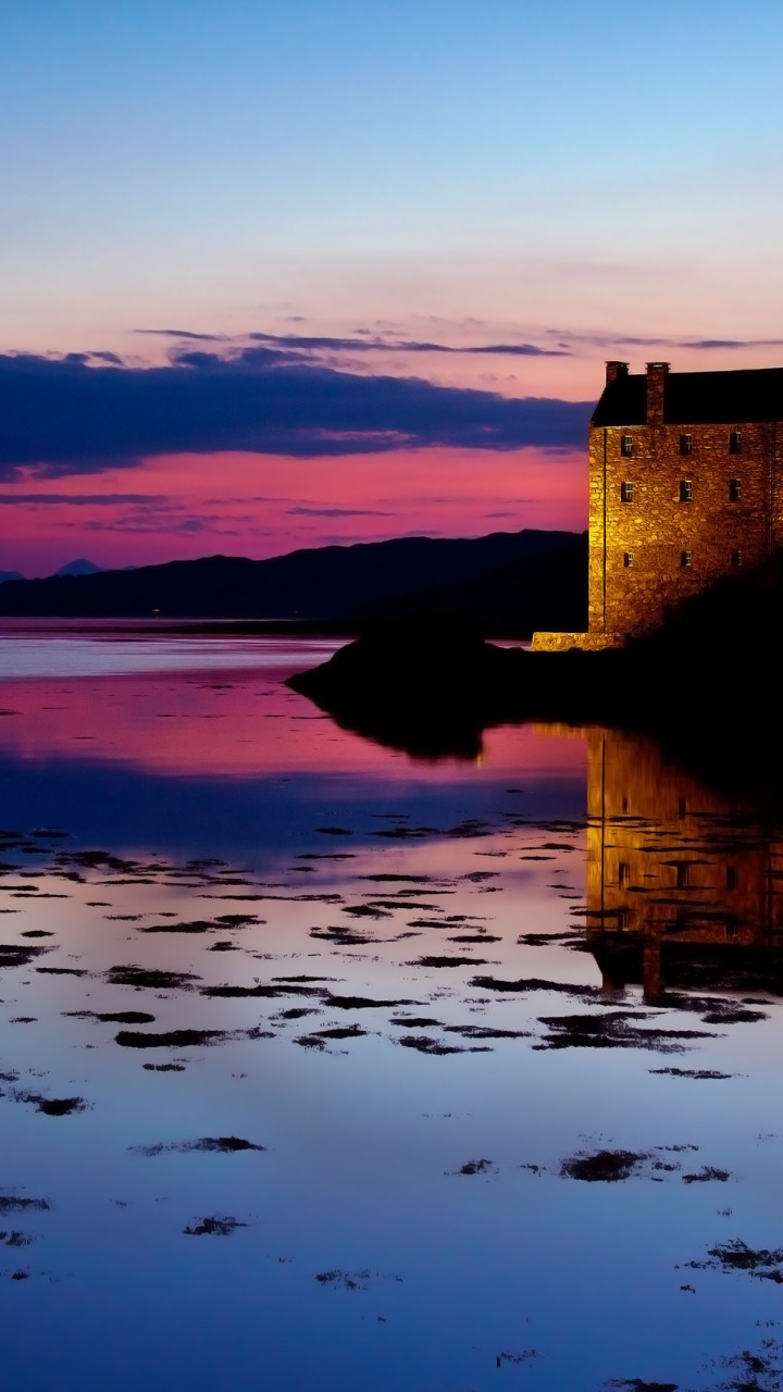 Back to Wallpaper the sky, water, sunset, clouds, reflection, castle, the evening, Scotland