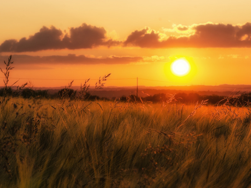 Back to Wallpaper field, grass, clouds, sunset, valley, horizon, power lines, orange sky