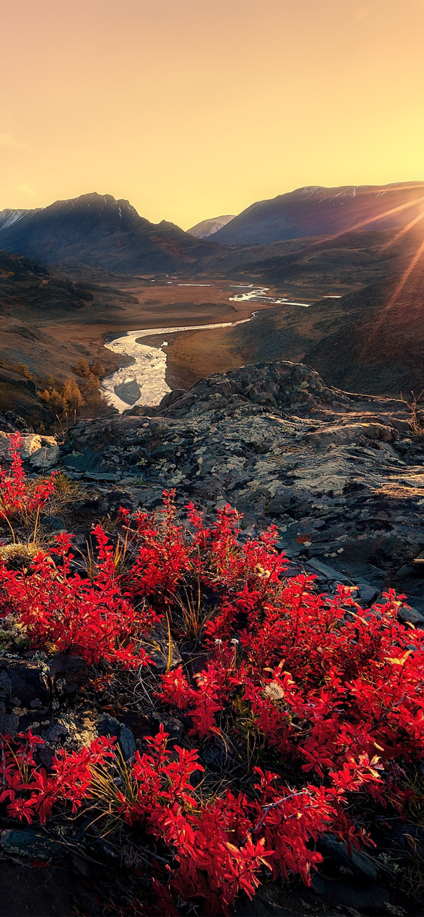 Back to Wallpaper the sun, rays, landscape, mountains, nature, river, vegetation, Altay