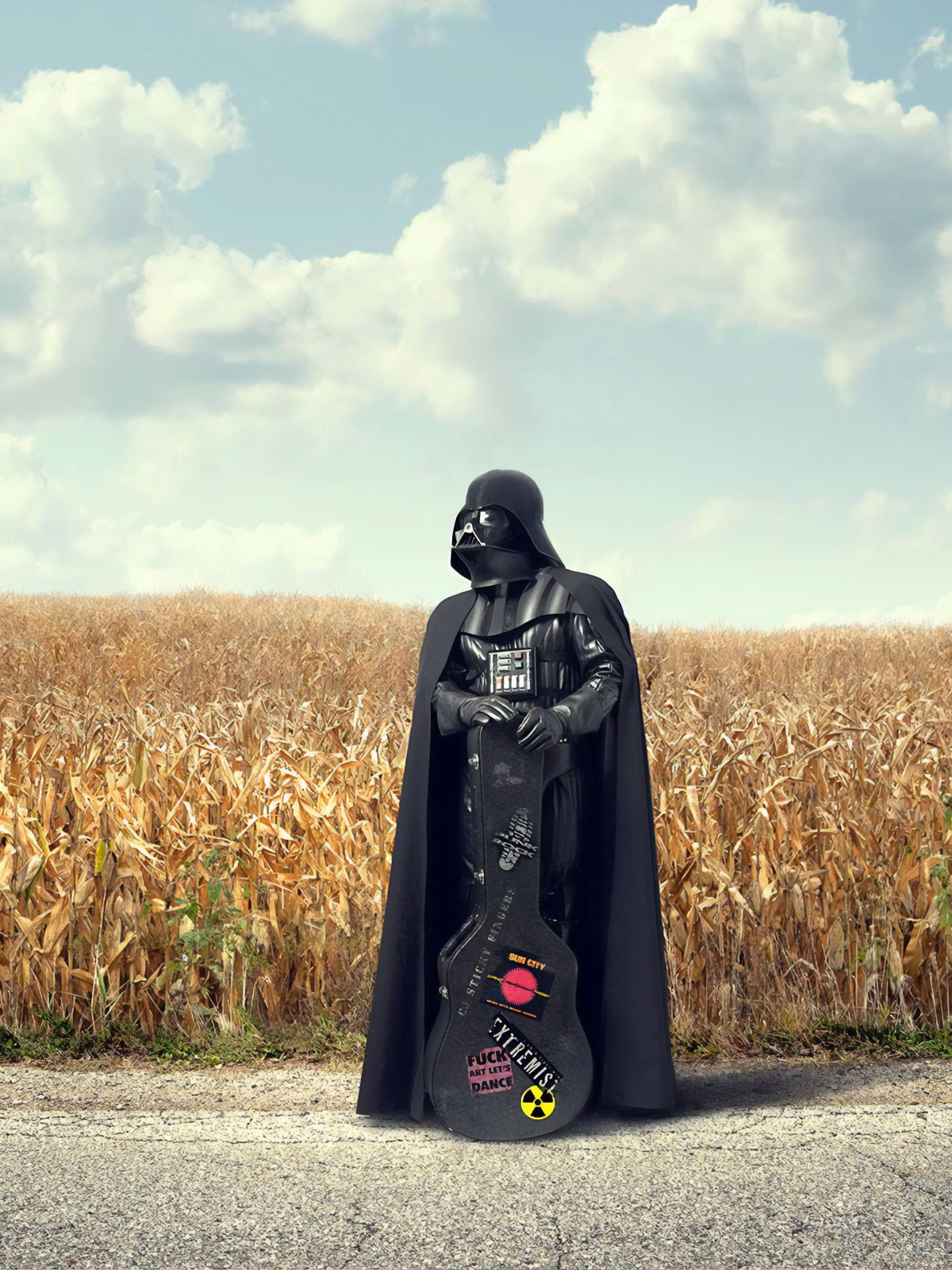 road, field, clouds, guitar, Darth Vader, cloak, Darth Vader