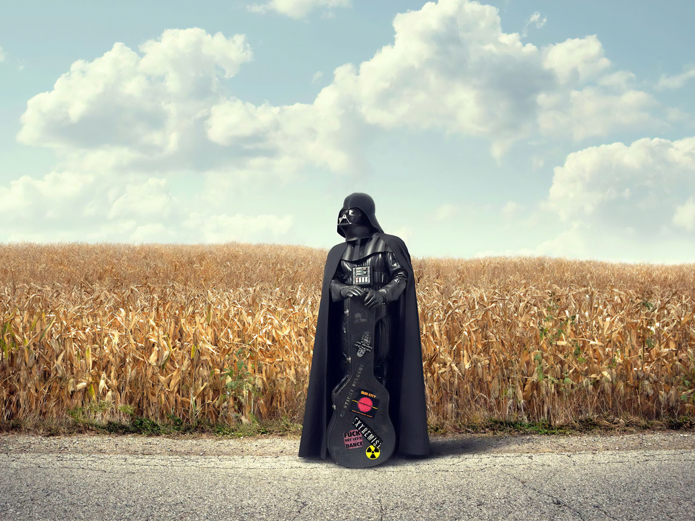 road, field, clouds, guitar, Darth Vader, cloak, Darth Vader
