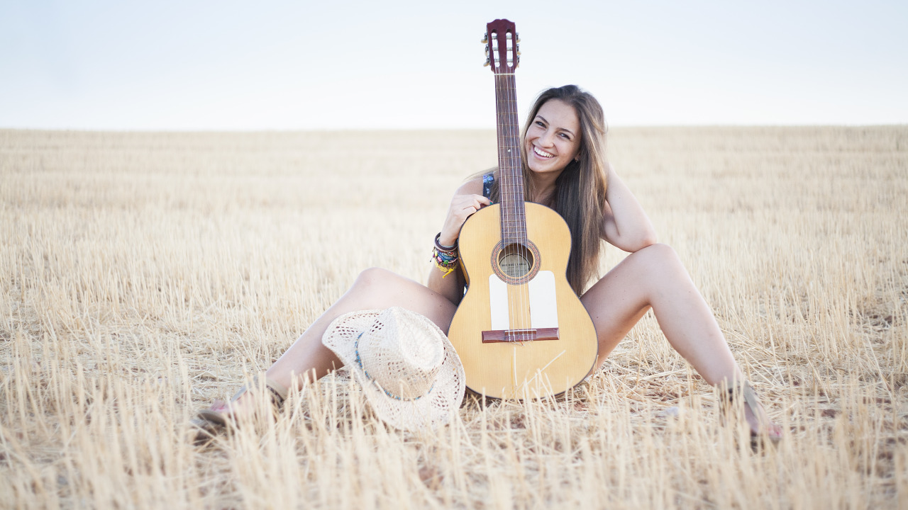 Back to Wallpaper field, girl, smile, music, mood, guitar