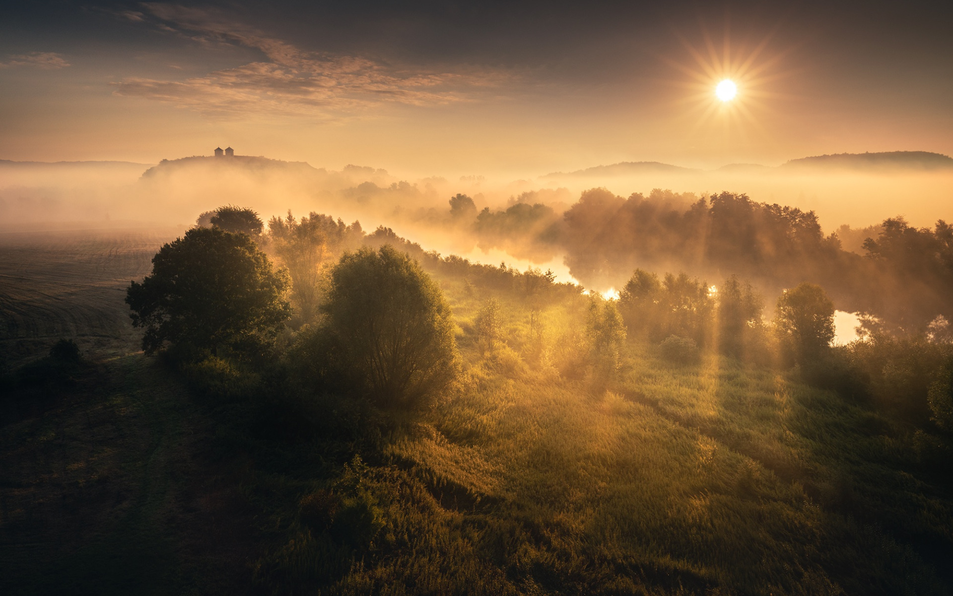 Back to Wallpaper the sun, rays, fog, river, sunrise, river, rays, sun