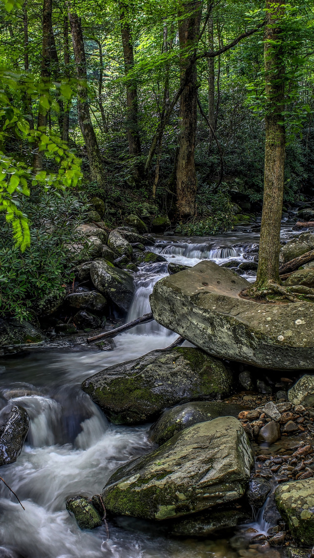 Back to Wallpaper greens, forest, trees, stream, stones, HDR