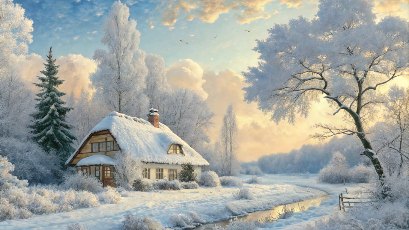 Back to Wallpaper winter, frost, snow, trees, river, house, AI art, neural network