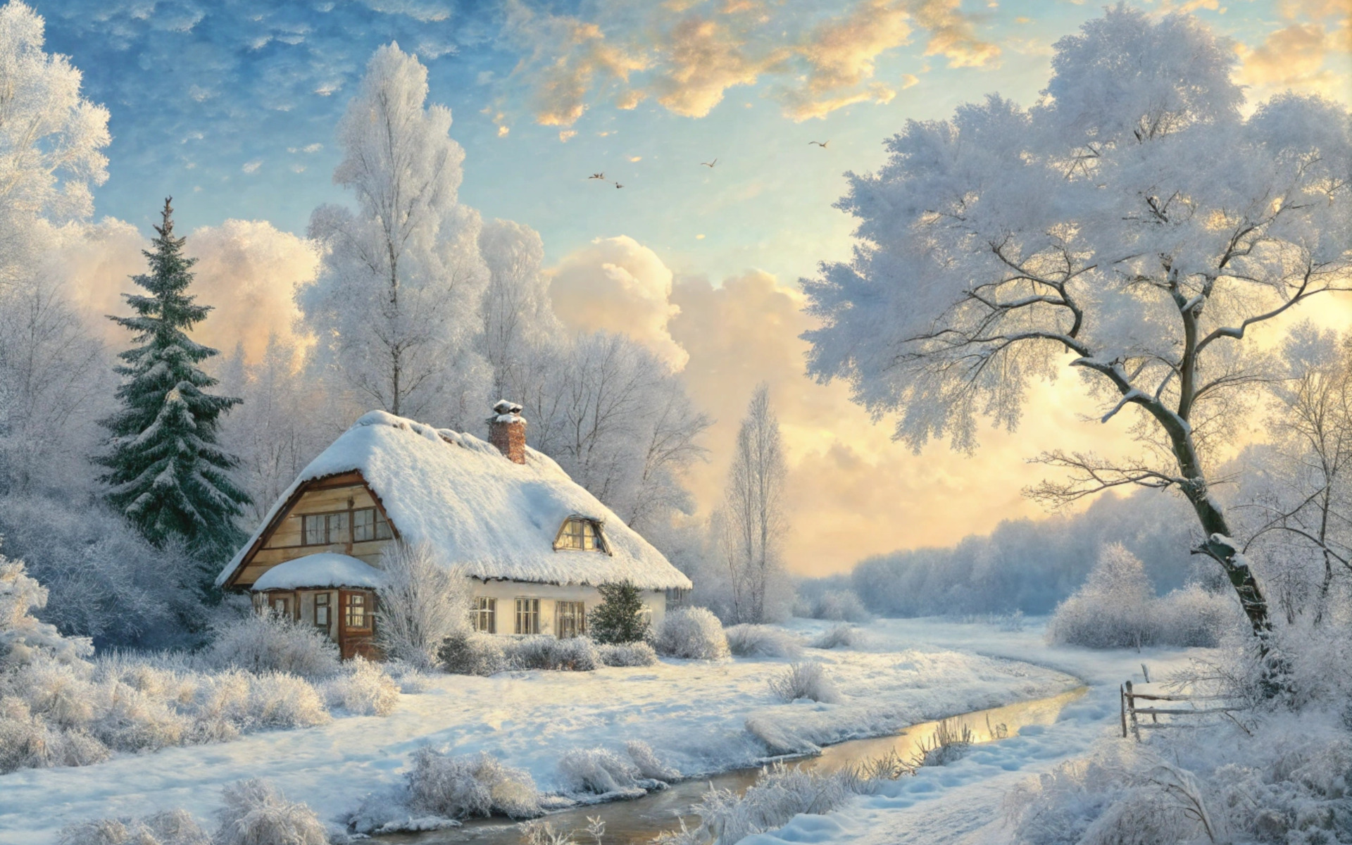 winter, frost, snow, trees, river, house, AI art, neural network