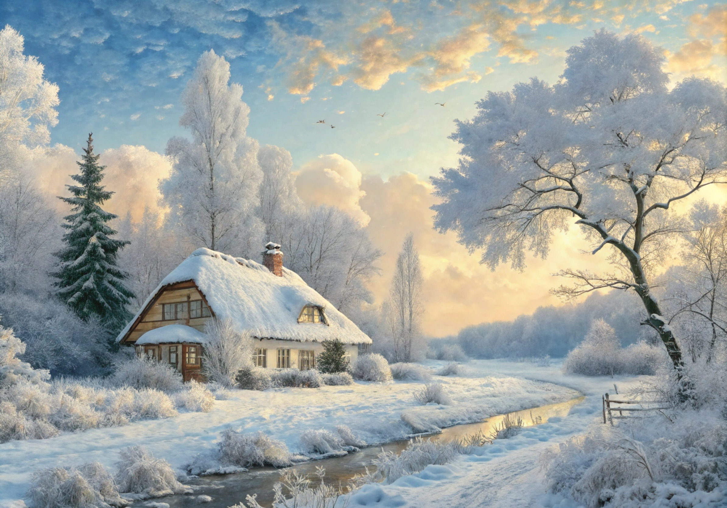 Back to Wallpaper winter, frost, snow, trees, river, house, AI art, neural network