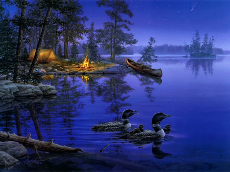 Back to Wallpaper forest, stars, night, nature, lights, lake, boat, duck