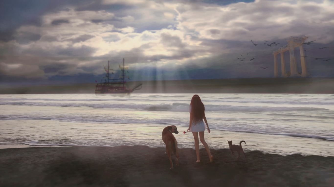 Back to Wallpaper cat, girl, fantasy, shore, ship, dog