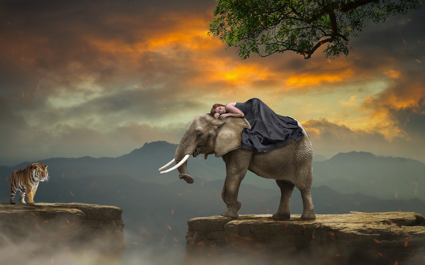 girl, trees, sunset, mountains, tiger, rendering, open, rocks