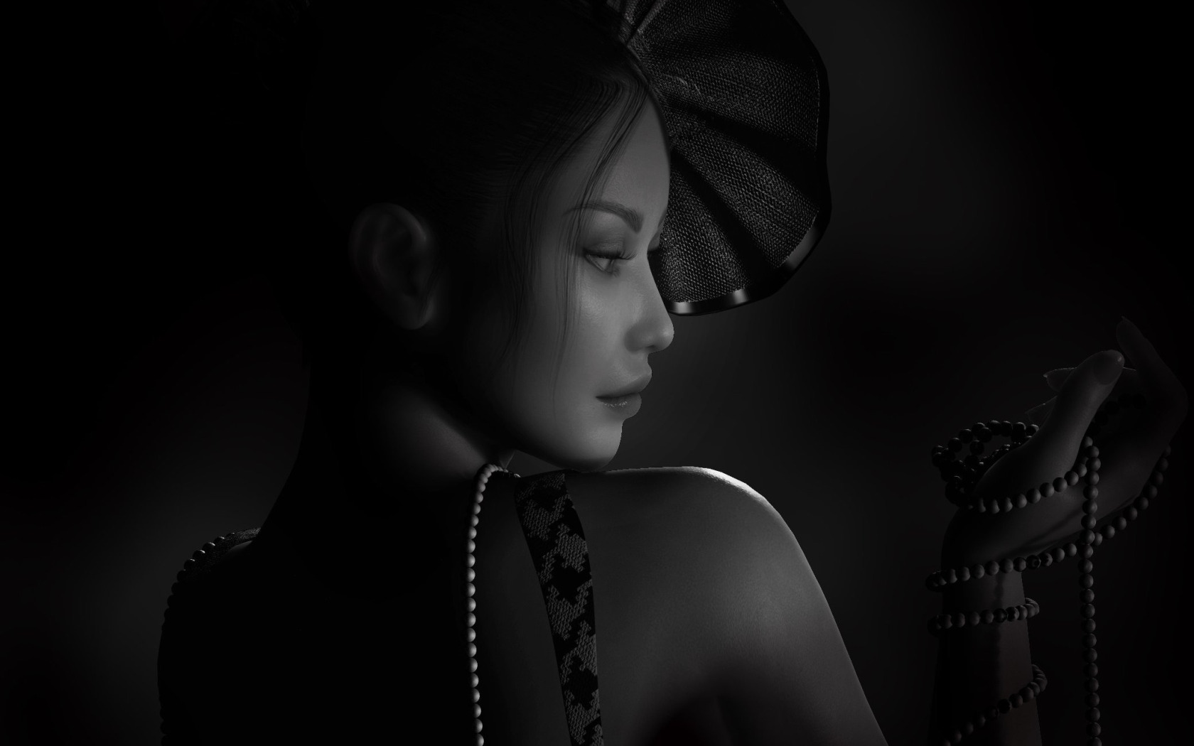 Back to Wallpaper look, girl, rendering, beads, profile, black and white, hat