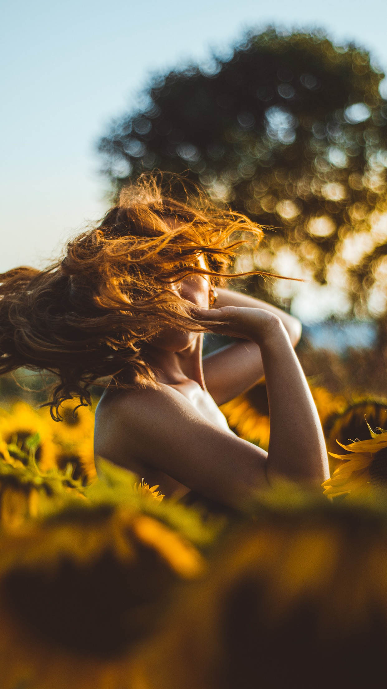 Back to Wallpaper field, summer, the sky, girl, clouds, light, trees, sunflowers