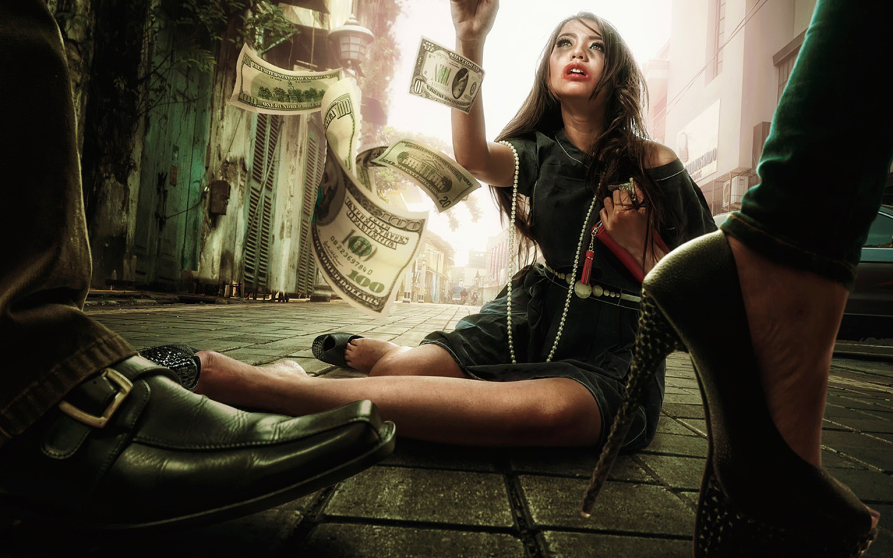 Back to Wallpaper girl, street, money, dollars, bills, passers-by