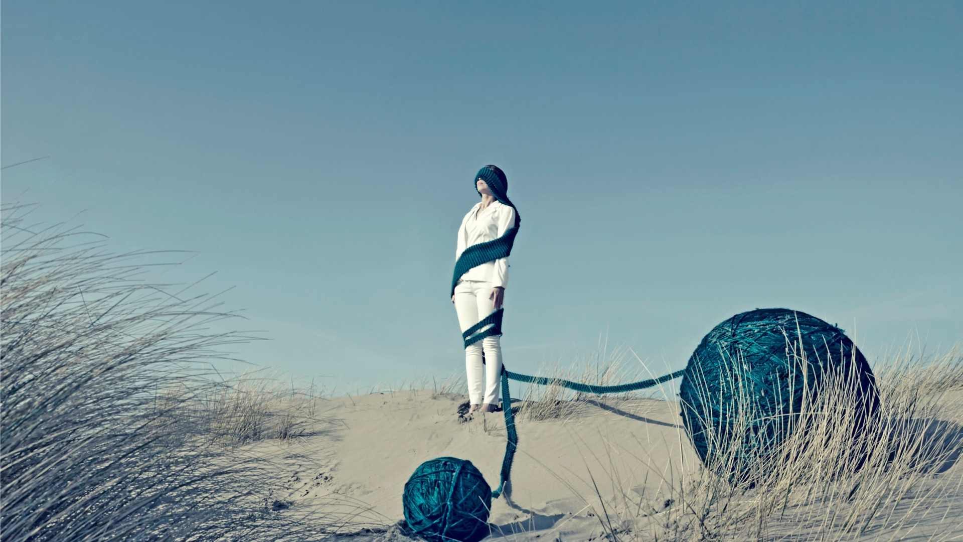 girl, tangle, desert, yarn