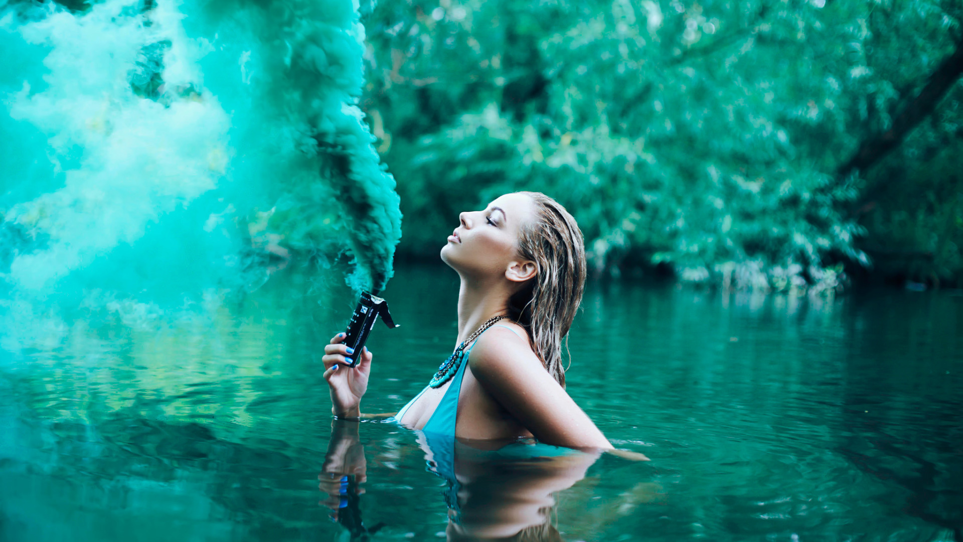 Back to Wallpaper girl, river, smoke, in the water