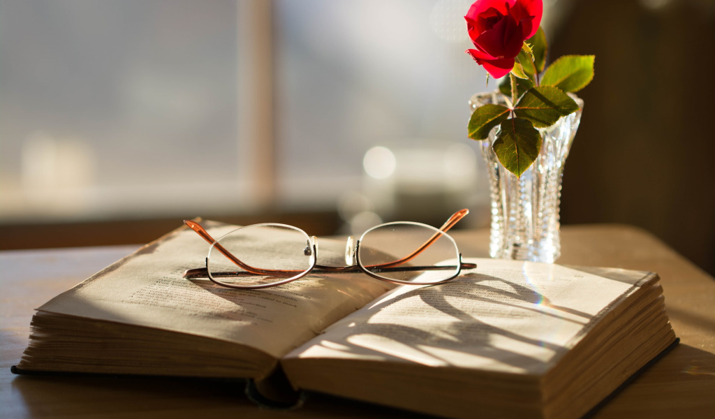 roses, glasses, book