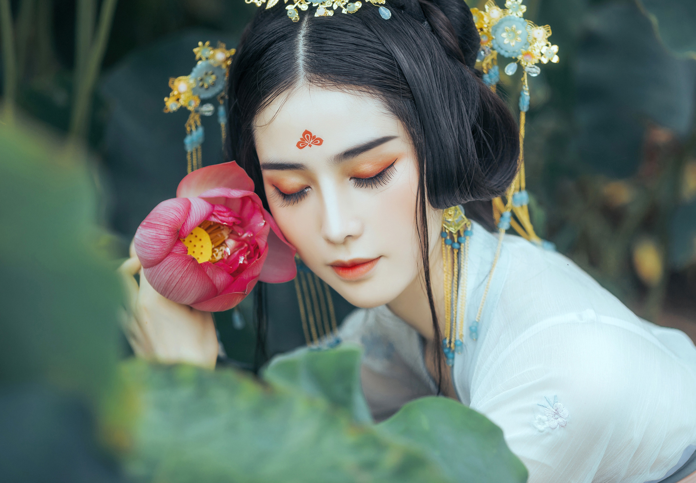 Back to Wallpaper white, leaves, girl, decoration, flowers, red, nature, face